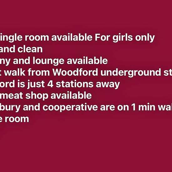 One single room available For girls only Neat and clean Balcony and lounge available 1 mint walk from Woodford underground station stratford is just 4 stations away Halal meat shop available Sainsbury and cooperative are on 1 min walk Single room £600