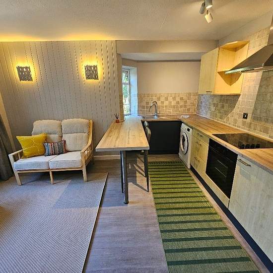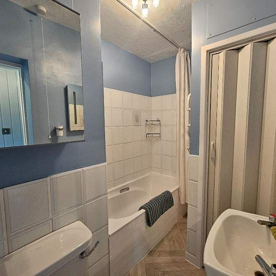 UPVC double glazed front door leading to: Entrance Hall: Electric heater to wall. Grey wooden effect flooring. Wooden door leading to: Bedroom: Double bedroom with bed and wardrobe. Double glazed window to front aspect. Electric heater to wall. Wooden door leading to: Bathroom: Suite comprising of bath with electric shower over, wash hand basin and low level W.C. Tri-folding door leading to airing cupboard housing hot water tank. Wooden door leading to: Open Plan Kitchen/Living Area: Kitchen area - grey wooden effect vinyl flooring. A ra...
