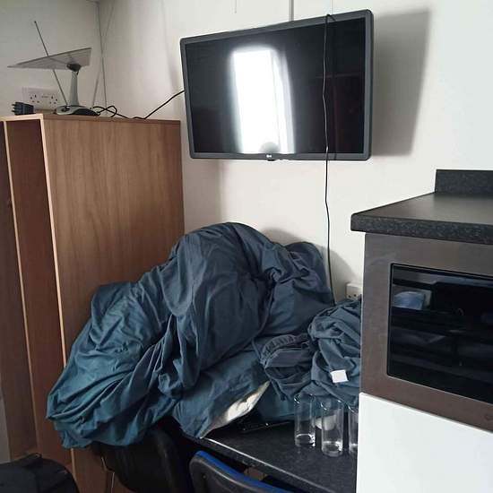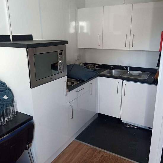 Office and living quarters. One side has TV and plenty space. Other side has bunk beds, kitchen and washing machine. Size is 30 feet x 10 feet. Buyer must uplift.