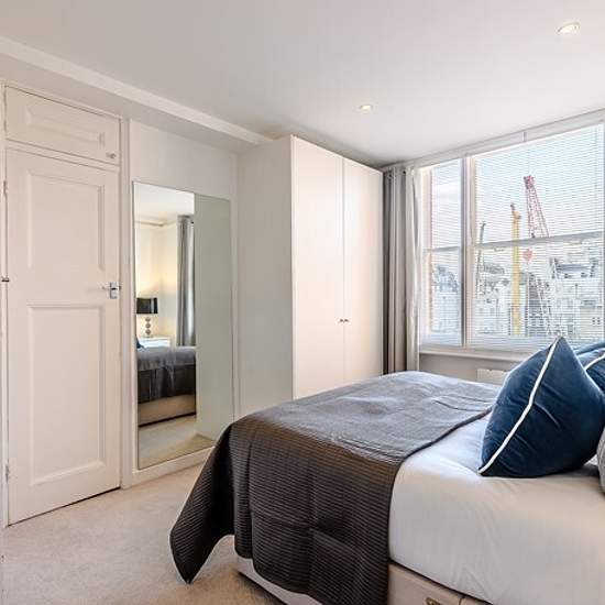 Second Floor – One Bedroom – 421 Sq Ft – One Bathroom £756 per week Features: CCTV, Digital TV, Furnished/Unfurnished Options, Elevator, Porter Service, Onsite Restaurant, Nearby Shops, Video Entry System Remote video viewings and virtual tours available by appointment. This charming one-bedroom apartment, covering 421 square feet, offers a spacious double bedroom with excellent built-in storage, a sleek, modern bathroom, a bright reception room with pleasant rear views over Hay’s Mews, and a distinctive kitchenette. Residents also enjoy acc...