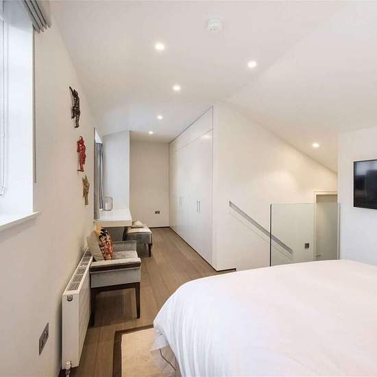 Comprising a spacious, open plan reception with fitted contemporary kitchen with Miele appliances and downstairs cloakroom. On the first floor, a bright and airy bedroom with plentiful fitted storage and en suite bathroom. Interior designed to a high specification throughout, this property benefits from wooden floors throughout and underfloor heating in the bathrooms.