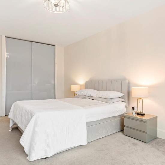 Situated on the second floor of the prestigious Royal Warwick Square development, this beautifully presented one bedroom apartment offers elegant and contemporary living. The property features a bright and spacious reception room with double-aspect floor-to-ceiling windows that open onto a full-length balcony, creating a wonderful sense of light and space. The high-specification open-plan kitchen is designed with both style and functionality in mind, seamlessly integrating with the living area. The double bedroom includes bespoke fitted ward...