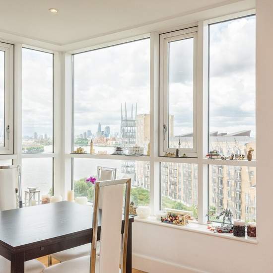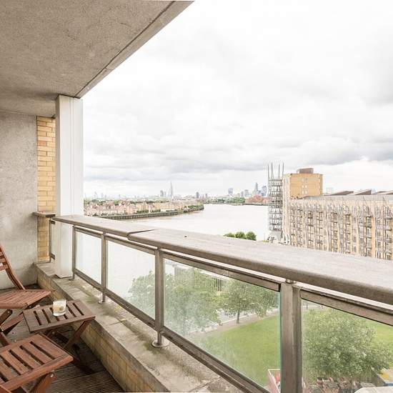 A bright, modern apartment featuring spacious bedrooms, sleek bathrooms, a contemporary kitchen, and an open-plan living area with impressive city and river views. The home offers a private balcony and access to landscaped communal gardens.