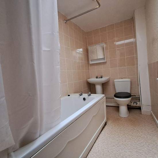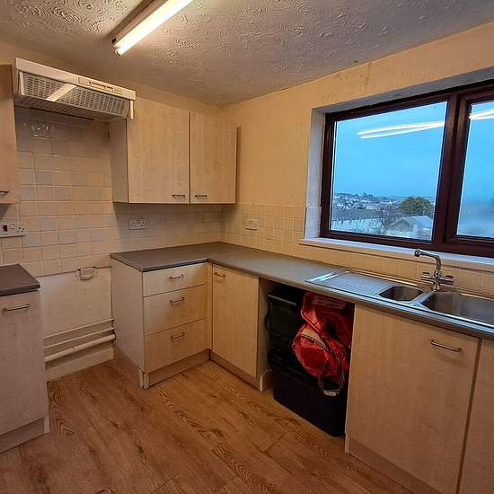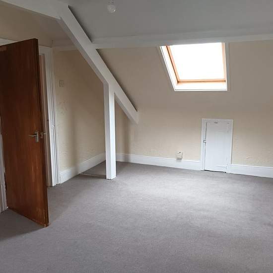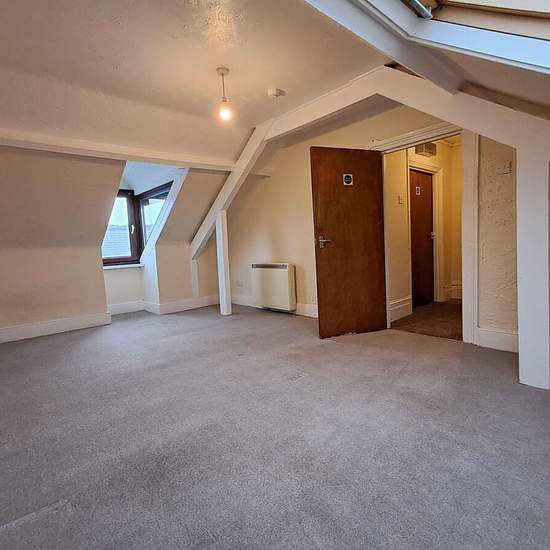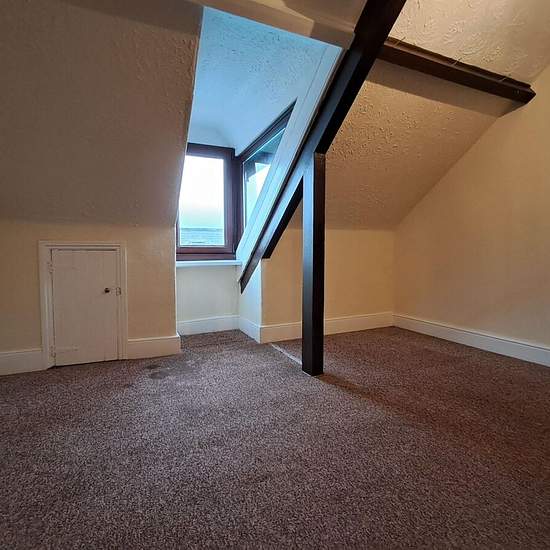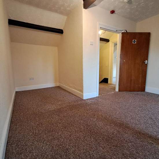 Unmöblierte 1-Schlafzimmer-Wohnung im obersten Stockwerk mit Ec7-Heizung. Die Wohnung befindet sich im zweiten Stock; Küche und Badezimmer gehen vom Treppenabsatz/Flur ab, und eine Treppe führt zum Doppelzimmer und zum Wohnzimmer, beide mit charaktervollen sichtbaren Balkendecken, neuem Teppichboden und Aussicht. Moderne Einbauküche mit Anschluss für Waschmaschine und elektrischem Anschluss für den Herd. Badezimmer mit elektrischer Dusche über der Badewanne. Gesicherter Hauseingang und in der Nähe aller Einrichtungen. Council Tax-Stufe: A (...