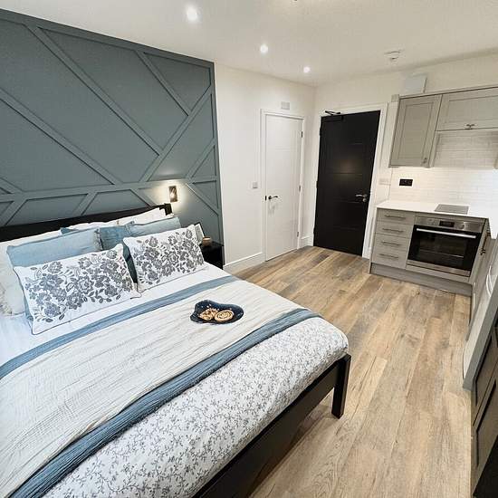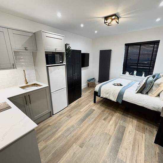 Spencers present this fully furnished, modern studio apartment, available beginning March. Situated within a spacious building with striking entrance hallway, each room has its own lockable front door. You will find a utility room with washer and dryer in the basement, additionally you also have access to the striking communal kitchen space for dining and storage needs as well as access to another two washer dryer sets. Included in the Bedroom space is a 50 inch Smart TV, Double bed with brand new high quality mattress, bedside tables ward...