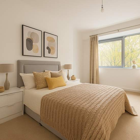 Modern and beautifully furnished 1-bed lakeside flat offering a calm, stylish living experience. The bright open-plan lounge features soft neutral tones, warm wood textures, and large windows framing scenic views of the surrounding trees and lake. A fully equipped contemporary kitchen and cozy dining area provide comfort and convenience. The inviting double bedroom includes quality furnishings and a restful atmosphere, while the sleek modern bathroom adds to the home's fresh, elegant feel. With secure parking included and excellent access to...