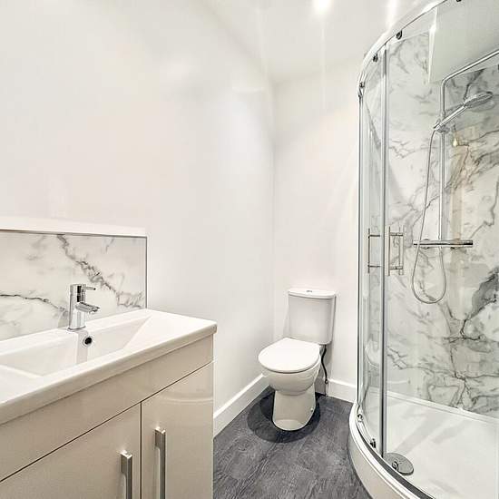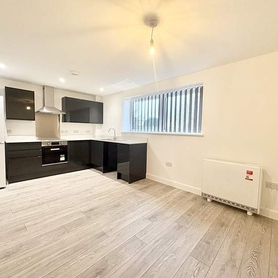 Located in the town centre, this first floor apartment is brand new. Accessed via a shared lobby, there is a generous entrance hallway with hard flooring, white walls and oak effect doors. The bathroom is a very smart white suite with walk in shower cubicle (no bath) and marble effect surrounds and there is a light, bright double bedroom with neutral decor. The primary space within the home is a large open plan kitchen/dining/lounge area. The kitchen has a high gloss, sleek units with integrated hob, oven, extractor and fridge freezer prov...