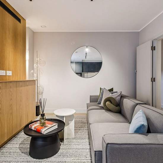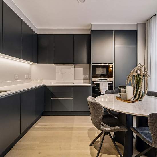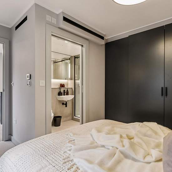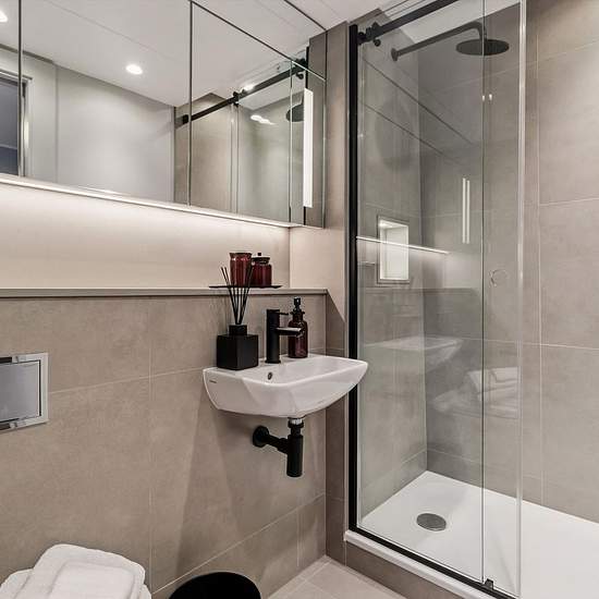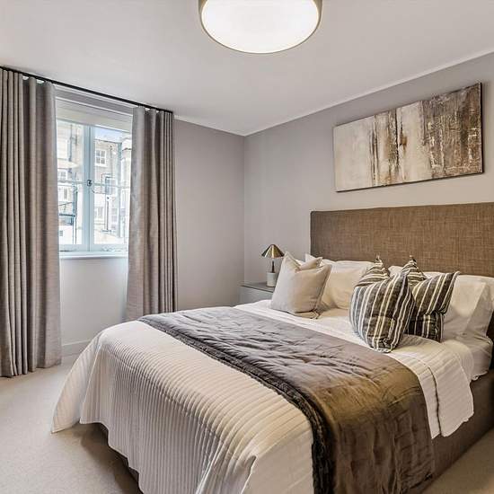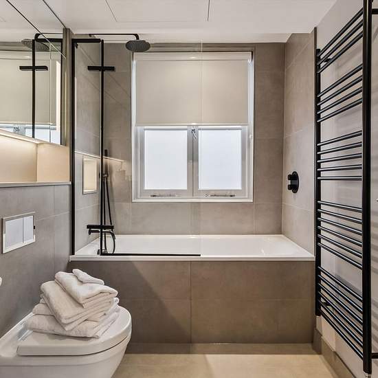 This two bedroom, two bathroom flat in Clenston Mews, London, offers modern living across 891 sq ft of space. The sleek kitchen features matte black cabinetry and white countertops, flowing into a comfortable reception room illuminated by natural light. Both bedrooms include en suite bathrooms with minimalist design and contemporary fixtures, ensuring privacy and comfort. The property includes built-in wardrobes and ample storage throughout. Practical features include additional storage solutions. Positioned in a tranquil mews, this flat com...