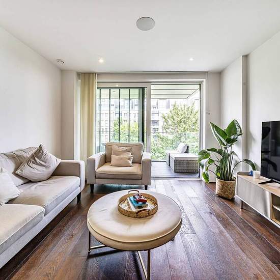 Stylish dark wood floors in the reception room Fully integrated kitchen with wine cooler Main bedroom features an en suite shower room Ample storage space throughout Private balcony with views of the river 24 hour porter and gym Available with Zero Deposit This beautifully finished 2 bedroom flat is situated within a stunning recently built riverside development and features spacious accommodation. There is a large supermarket moments from the property while the Thames Path and the green spaces of South Park are also close by.