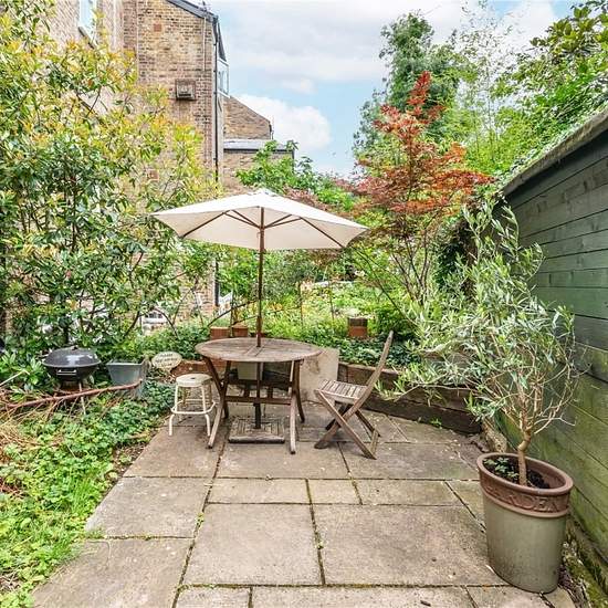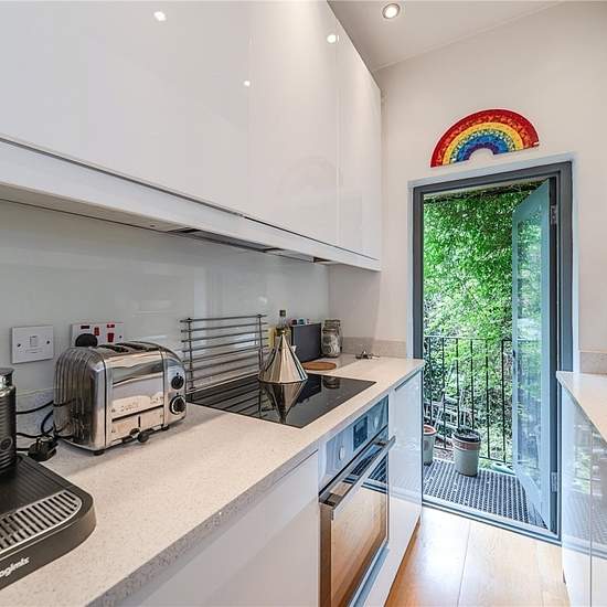 The beautifully refitted kitchen is both stylish and practical, featuring a glass door that opens directly onto the rear garden. The generously proportioned principal bedroom also benefits from a large bay window and is complemented by a sleek en suite shower room. A second well-sized bedroom is served by a separate modern bathroom. Residents enjoy access to a tranquil communal garden, which can be reached directly from the flat and provides convenient side access to the front of the building, a peaceful, leafy retreat in the heart of the ci...