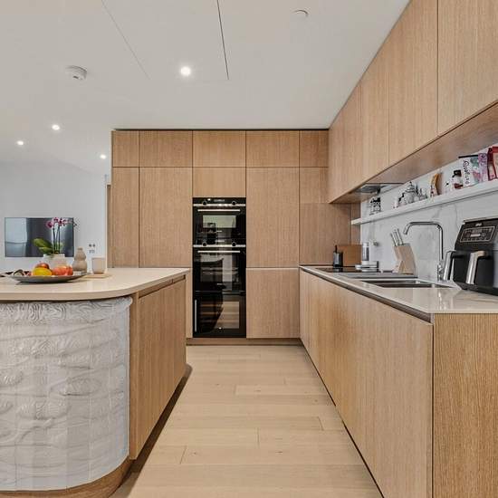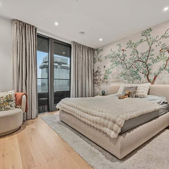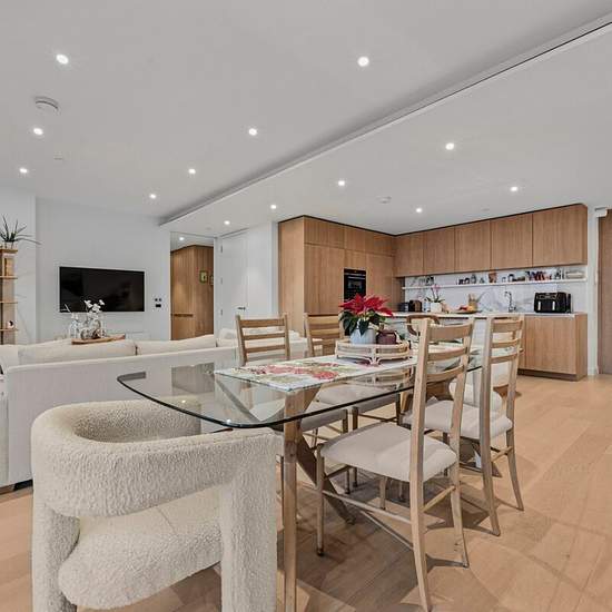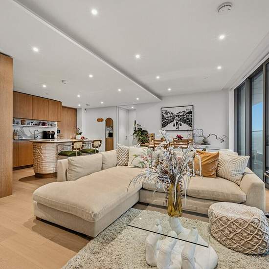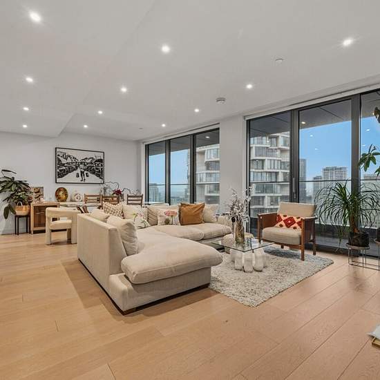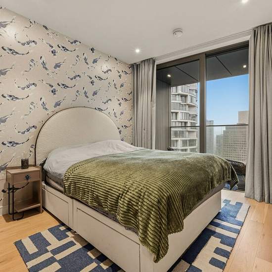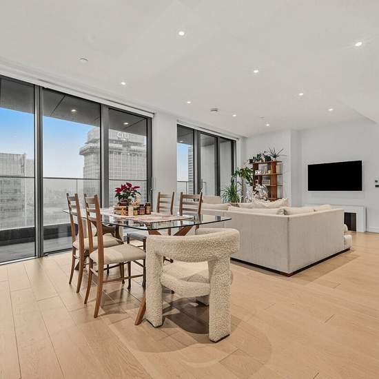 A stylish apartment in 10 Park Drive, featuring contemporary interiors, floor-to-ceiling windows, a private balcony. Moments from excellent transport links.
