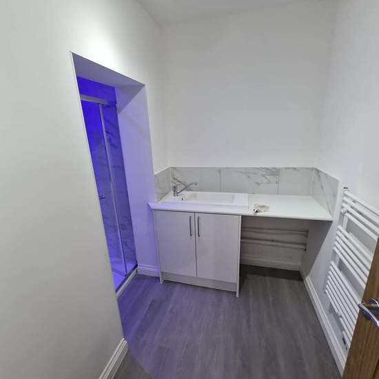Abode are delighted to offer to market this newly renovated first floor apartment. Finished to a high standard throughout, this stunning flat comprises of a light and open plan living space, with three large double glazed windows. A newly fitted shaker style kitchen include fridge, basin, washing machine, and electric oven. The shower room is finished to a similar high standard and includes a lovely blue lit shower, basin with vanity beneath and WC. The building itself is an imposing Tudor period building, centrally located in Royston and be...