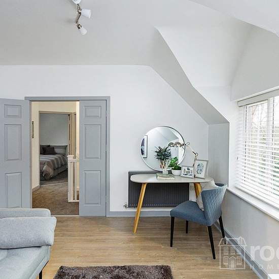 Stunning interior designed furnished detached Coach House apartment. This stunning Coach House resides at the end of a quiet cul-de sac near Stafford town centre. The property comprises an entrance porch with stairs leading to the upper hallway. On this floor is an open plan kitchen/lounge with stunning “U” shaped kitchen. There is a family bathroom with shower over bath, two double bedrooms and a storage cupboard.. Underneath the apartment is a larger than average garage with a lockable storeroom.