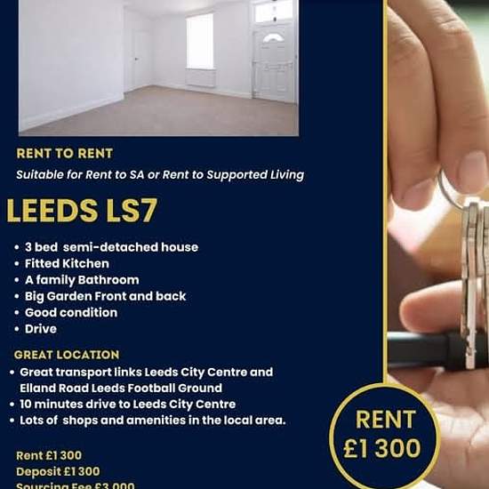3 bed House For COMPANY LET IN Leeds Suitable for Rent to SA or Rent to Supported Living LEEDS LS7 3 bed semi-detached house Fitted Kitchen A family Bathroom Big Garden Front and back Good condition Drive Great location Great transport links Leeds City Centre and Elland Road Leeds Football Ground 10 minutes drive to Leeds City Centre Lots of shops and amenities in the local area. Rent £1 300 Deposit £1 300 Sourcing Fee £3,000