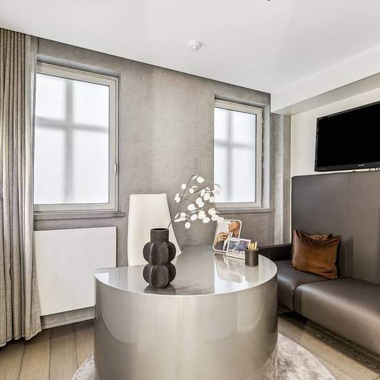This modern, second-floor apartment is set within a handsome Victorian building and boasts four spacious bedrooms, a large open-plan reception room, office and a private spa room and sauna. Wooden floors, dual-aspect windows and a working-fireplace create an inviting atmosphere in the grand reception room. Sliding doors separate the reception room from the open-plan kitchen / dining room which features sleek cabinetry, a contemporary light fixture and an abundance of natural light thanks to the two large windows. There are four generously pr...