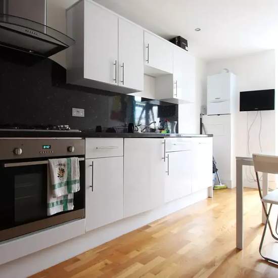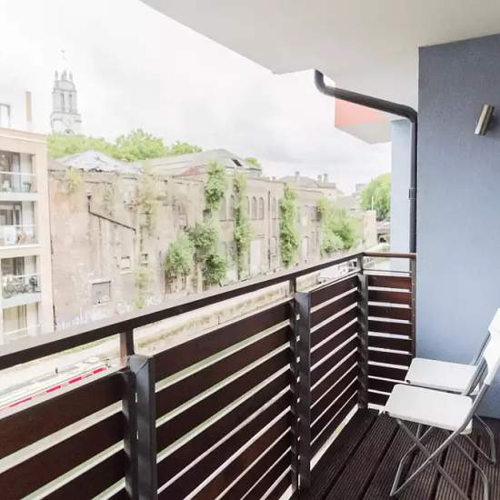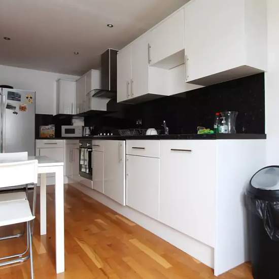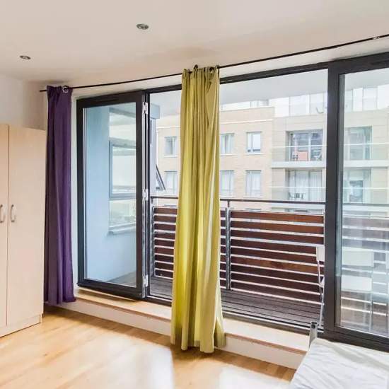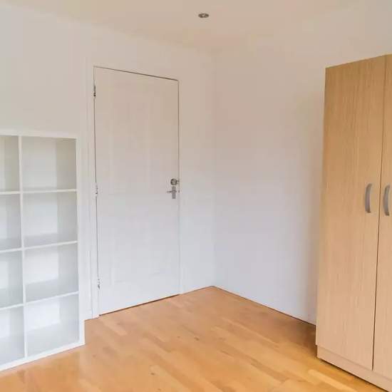 Bedroom 3 is a furnished room with a double bed, a desk, and access to its own private balcony. There is also a standalone wardrobe and an independent key. Rooms are available to rent in a 3-bedroom flatshare in a new building in Limehouse. East London. The property is modern, spacious and bright, with laminated wooden floors throughout. The kitchen is quite large and has an American-style fridge, oven, dishwasher and washing machine. The shared bathroom has a bathtub with a jacuzzi function. One bedroom has a balcony. The apartment is locat...
