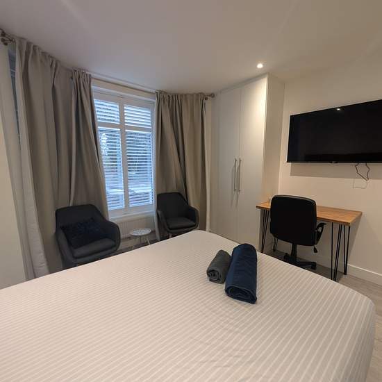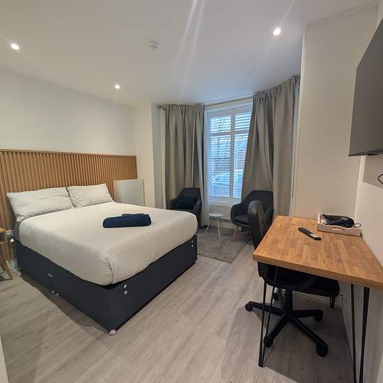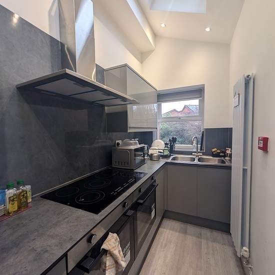Zero Deposit Guarantee Available This spacious en-suite room in a modern 6 bed HMO comes fully furnished, including a Hisense TV for your personal use. The property features a large communal kitchen and dining area, designed for comfortable shared living. The dining space also includes a wall mounted large TV, perfect for relaxing or socialising with housemates. All bills are included, and the home is equipped with two washing machines and two dryers, both externally fitted to keep noise to a minimum. Residents also have access to a com...