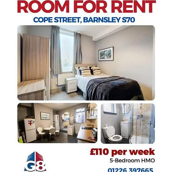 En-Suite Room To Rent | Cope Street, Barnsley S70 £110 per week | Fully Furnished | All Bills Included High-Standard Professional House Share Welcome to this exceptional 5-bedroom shared terraced property on Cope Street, Barnsley. Finished to a high standard throughout, this home offers modern, comfortable living just a short walk from Barnsley town centre — ideal for professionals seeking convenience and quality. En-Suite Double Bedroom • Private en-suite bathroom • Fully furnished with bed, wardrobe & storage • Comfortable, modern dé...