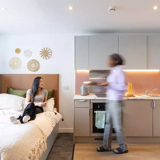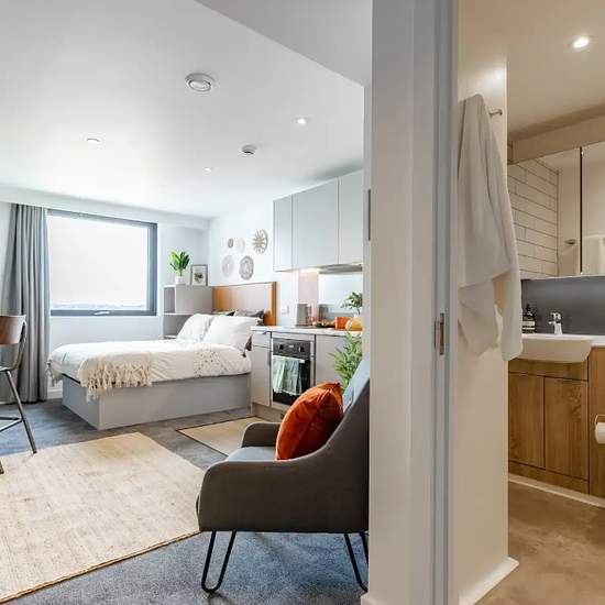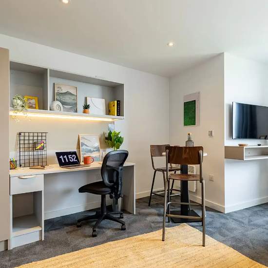 Experience a vibrant and comfortable student lifestyle at True Manchester Salford. A diverse array of room types cater to different preferences, including the True Sky Studio Plus, True Superior Studio Plus, and True Studio Plus, amongst others. Each contains a double bed with a True mattress, providing ultimate comfort after a busy day. Space will never be a concern with the ample storage area, including under-bed storage and wardrobe and storage space. Complete assignments with ease at your desk and chair, or relax in the stylish snuggle...