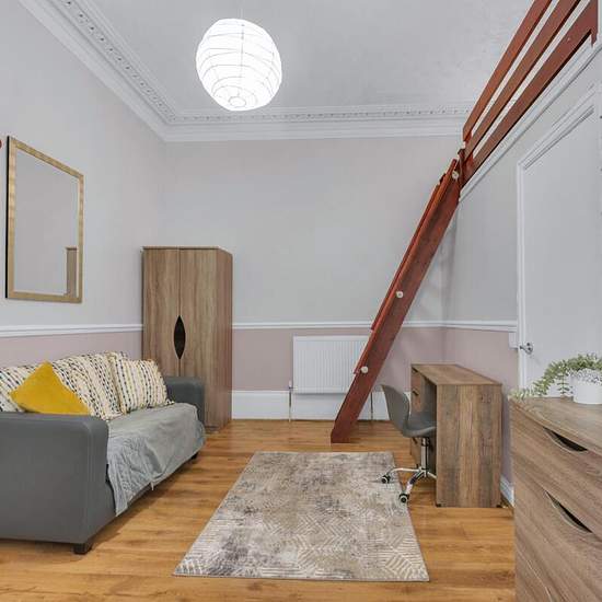 Spacious Studio Apartment – Central Heating Included Central heating included in the rent A spacious studio apartment featuring a fitted kitchen with washing machine and a fully tiled bathroom with shower. The living area is furnished with Walnut furniture, glass TV stand, and coffee table, with a double bed on a mezzanine floor to maximise space. Additional benefits include large private gardens, off-street parking, and proximity to the Vue Cinema complex, excellent transport links to the city centre, and a train station just two minutes’ w...