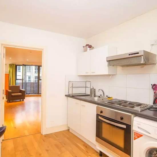 This splendid studio is for rent in the Tower Hamlets area of London. It has a great balcony that looks over the lovely canal below. The living room is huge, has wooden flooring, and full-size windows around one side. It offers a TV, armchair, desk, chest of drawers, and a wardrobe. The sleeping area includes a comfy double bed, bedside table and a chest of drawers. The kitchen is fully equipped and has a microwave, oven with gas hobs, and a washing machine. The bathroom has a standup shower, heated towel rack, and the essentials. This perfe...