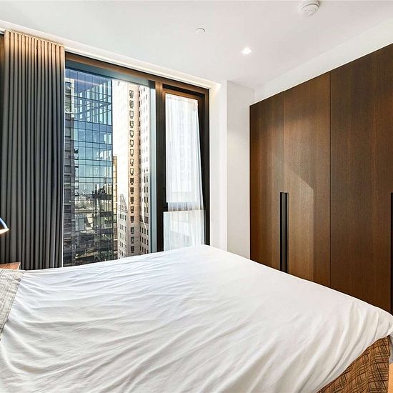 The corner aspect on this apartment, located on the 15th floor, allows natural light to flood in from all angles. The 44 sq balcony also provides desired outside space. Miele appliance are fitted throughout the beautifully finished kitchen which holds amble dining space and a breakfast bar. The bedroom features sliding floor to ceiling windows, and ample storage space with the built-in soft close wardrobes with motion activated lighting. The already generous storage capacity is bolstered with further similar storage cupboards in the hallway....