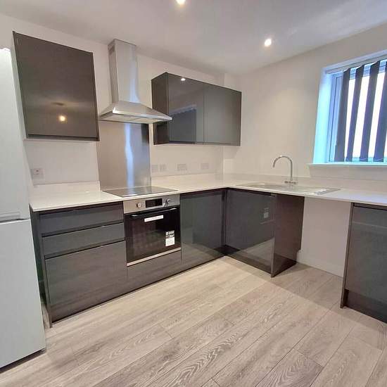 Located in the town centre, this first floor apartment is brand new. Accessed via a shared lobby, there is a generous entrance hallway with hard flooring, white walls and oak effect doors. The bathroom is a very smart white suite with walk in shower cubicle (no bath) and marble effect surrounds and there is a light, bright double bedroom with neutral decor. The primary space within the home is a large open plan kitchen/dining/lounge area. The kitchen has a high gloss, sleek units with integrated hob, oven, extractor and fridge freezer prov...