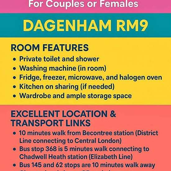 Hi I have en-suite available fully furnished ready to move in. Preferably females or couple and vegetarian. 10 min walk away from Becontree station