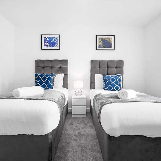 The property comes fully furnished and equipped for longer stays, having WiFi, bed linen, towels, toiletries and Netflix for your comfort. The entire space will be available to you and your group. This accommodation comes with full secure access and is cleaned to the highest standards prior to your arrival. There are 2 spacious bedrooms with 3 single beds, able to comfortably accommodate 3 guests. This property is spacious and modern and comes with a 50" Smart TV for your entertainment. Guests can access Netflix free of charge from our accou...