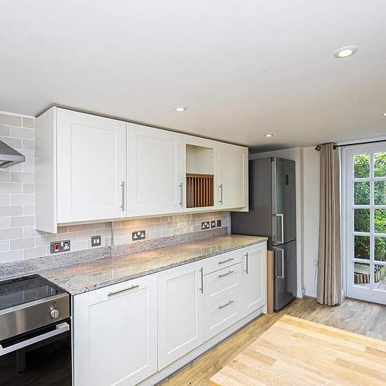 Internally, the ground floor of the property offers a spacious modern fitted kitchen with integrated appliances, lounge with french doors to the rear garden and downstairs bathroom. On the second floor, there are two double bedrooms. One of the bedrooms benefits from fitted wardrobes and storage. Externally the property benefits from a private rear garden that is mainly laid to lawn, with a small patio area and storage sheds. Council Tax Band E