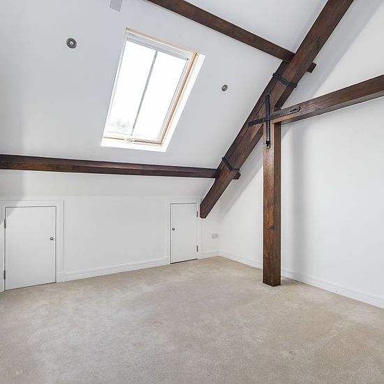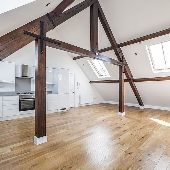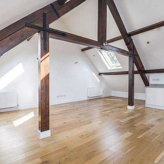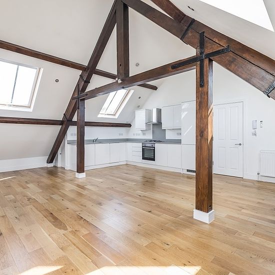 Exceptional two bedroom apartment set within a beautiful former Victorian chapel, rich in character and original features. The property opens into a private hallway with stairs leading to the first floor. The layout offers two spacious double bedrooms, two well-appointed bathrooms, and a bright open-plan living and kitchen area with wooden flooring and fitted appliances. The apartment boasts a stunning circular stained glass window, exposed wooden beams, and useful eaves storage. Further benefits include two allocated parking spaces. To c...