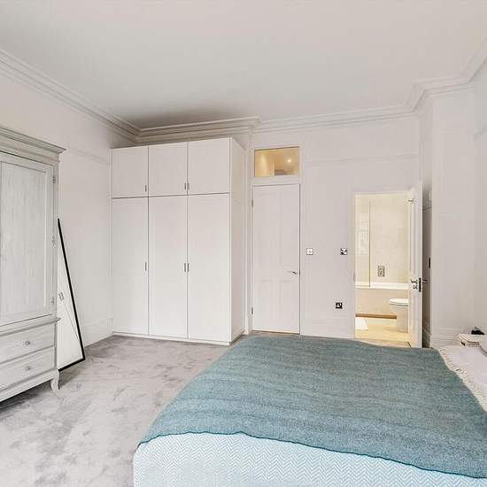 The property is arranged around an impressive open-plan reception, dining and kitchen space extending over 21 feet, providing an exceptional setting for both everyday living and entertaining. Flooded with natural light from large windows overlooking the garden square, the room features wooden flooring, high ceilings and a sleek, modern kitchen fitted with integrated appliances and extensive cabinetry. The principal bedroom is quietly positioned to the rear and benefits from a bay window, excellent built-in storage and a stylish en suite bath...