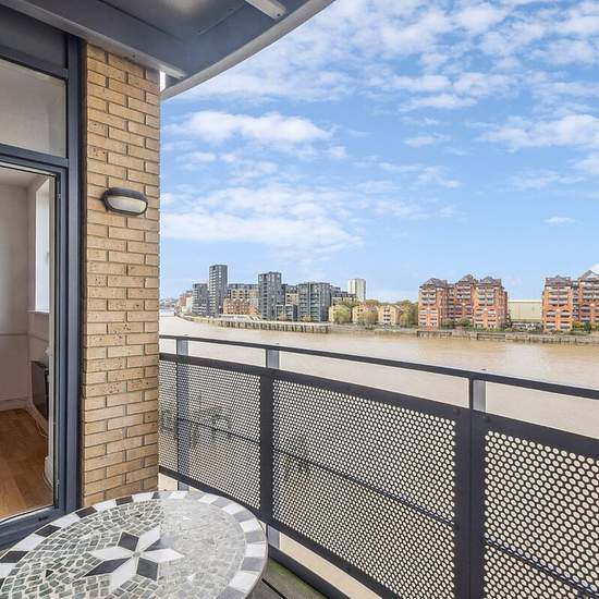 A spacious two bedroom, two bathroom waterside apartment on the second floor(with lift) in this modern purpose built block. The apartment benefits from wood flooring throughout, built-in kitchen appliances, including a washer/dryer and dishwasher. Two bathrooms, one en-suite, and direct access to a private balcony offering uninterrupted river views from the large open-plan reception room with space for dining. Secure underground parking is available via separate negotiation. The property also benefits from an onsite concierge service. The lo...