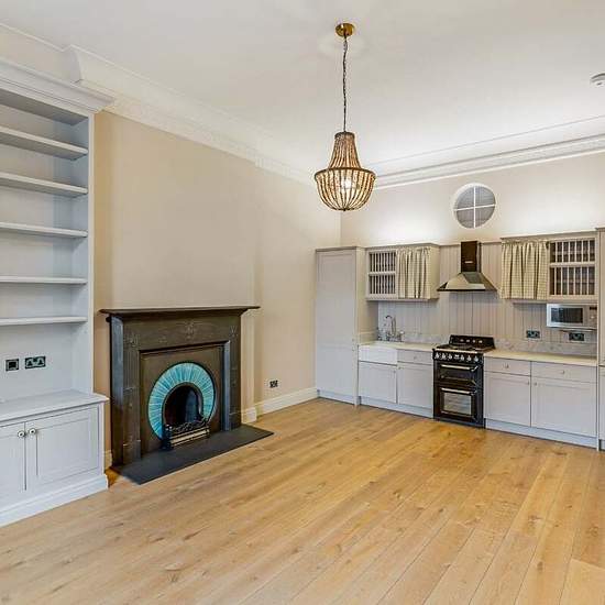 A beautifully decorated two-bedroom flat combining period charm and modern comfort with its own entrance porch and front door. This 745 sq ft apartment features high ceilings, an open-plan kitchen and living space with wooden flooring and a welcoming, Art Deco open fireplace. The bedrooms are fitted with newly laid sisal carpet, adding warmth and texture throughout. The principal bedroom is decorated in a classic Colefax and Fowler striped wallpaper, and the second bedroom features a skylight, bringing natural daylight into the room. The bat...