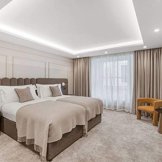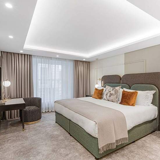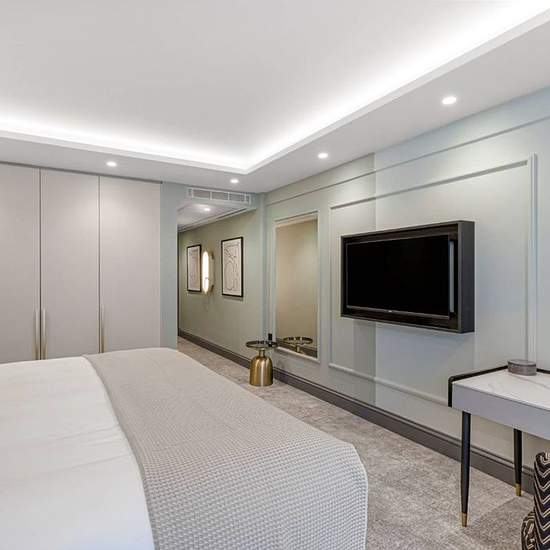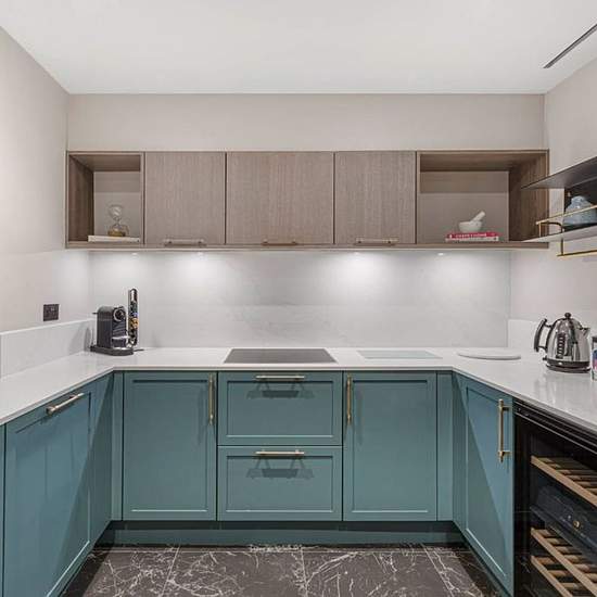 This recently refurbished deluxe two bedroom apartment, opposite Kensington Gardens is where the grandeur of 19th-century architecture meets comfortable and convenient contemporary style. The fully-fitted kitchen is equipped with Miele appliances, a wine cooler and a Nespresso machine. The spacious open plan living and dining room has a large window ensuring an abundance of natural light and built-in cabinetry. Parquet flooring and a neutral colour palette come together to create a serene atmosphere in the living space. There is also a WC fo...