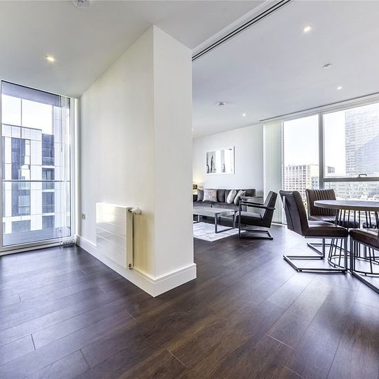 Modern two bedroom apartment in the popular Maine Tower, E14, with south facing balcony and excellent views. Finished to a high standard throughout with walnut flooring, LED lighting and comfort cooling. The kitchen includes stone worktops and integrated Smeg appliances, with built in storage in the living area. Both bedrooms are carpeted with floor to ceiling fitted wardrobes. Residents benefit from a business centre, meeting rooms, cinema and 24 hour concierge. Ideally located just 2 minutes from South Quay DLR and an 8 minute walk to Can...