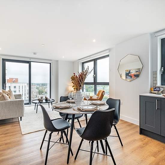 This spacious two bedroom, two bathroom apartment at One Maidenhead features an open-plan living area for the kitchen, lounge and dining spaces, with the addition of a terrace. Integrated kitchens feature energy-efficient Beko appliances including an oven, an induction hob, dishwasher, built-in microwave and come with plenty of cupboard space. The bedroom has built-in wardrobes and your washer-dryer is conveniently tucked away in a utilities cupboard. This fully-furnished apartment comes with everything you need to help you feel at home rig...