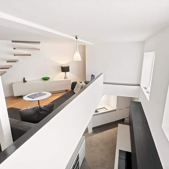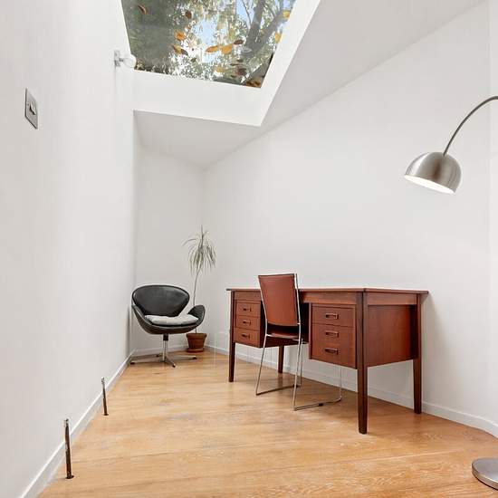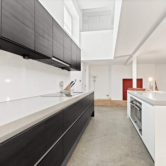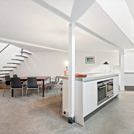 Short Let - Positioned on a quiet corner of Penzance Place, this two-bedroom home combines modern design with a calm, light-filled interior. Pale timber floors and white walls create a bright, understated backdrop for mid-century furnishings and textured details. The entrance opens into a spacious reception room with a minimalist aesthetic and warm natural tones. A glass-panelled cantilevered staircase leads down to the open-plan kitchen and dining area, where stone flooring and dark cabinetry add a contemporary edge. A raised study area, po...