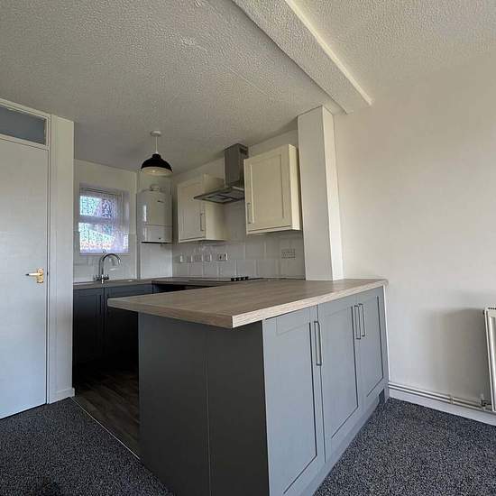 Newly refurbished terraced house benefitting from a driveway for two cars and a private garden. You enter the property in to the open plan lounge kitchen which has been newly fitted with a range of wall and base units, electric oven and hob with extractor over, space for washing machine and tall standing fridge/freezer. The kitchen also benefits from a breakfast bar. At the end of the lounge are large sliding patio doors leading in to the private garden which is mainly laid to lawn. Upstairs you will find two double bedrooms, one with a sm...