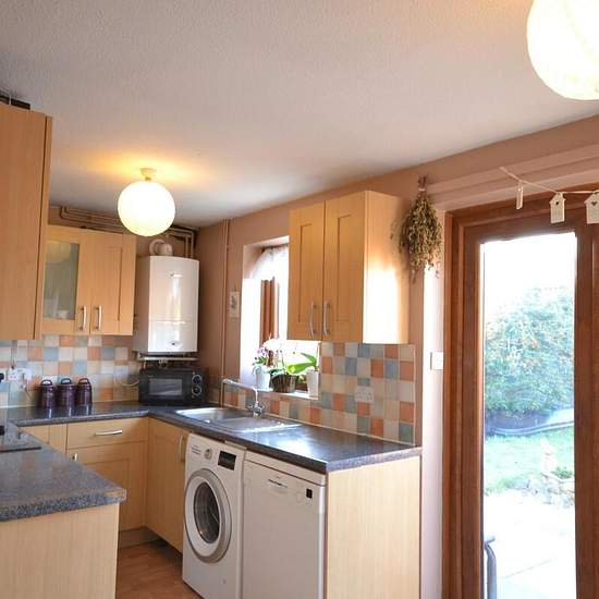This is a charming two bedroom terraced house at the end of the cul-de-sac. Through the front door there is a small internal porch with space for coats and shoes. The sitting room is a good size with a feature fireplace, laminate oak effect floor and window looking out on to the greenery in front of the house. The kitchen runs across the back of the house and has plenty of cupboards and work space, with electric hob and oven. There is also a free standing fridge freezer and a fold down dining table and chairs. Double doors lead on to the gar...