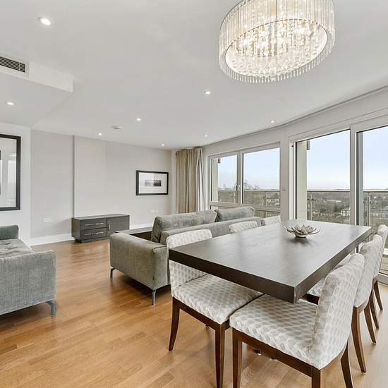 3 Bedrooms 2 Bathrooms Upper Floor Balcony A superb three bedroom apartment on the ninth floor of this exclusive development, offering stunning views across the River Thames. The apartment briefly comprises a large open plan reception / dining room, fully integrated kitchen, a master bedroom benefiting from built in wardrobes and an en-suite bathroom, two further double bedrooms and a modern family bathroom. Additionally the apartment benefits from underfloor heating comfort cooling throughout, fibre optic home broadband enabling download...