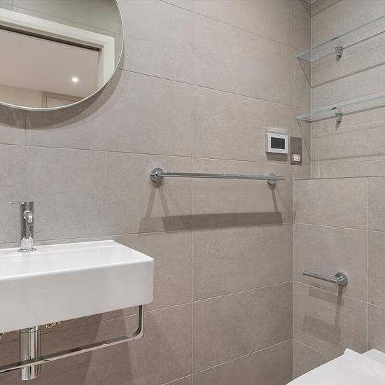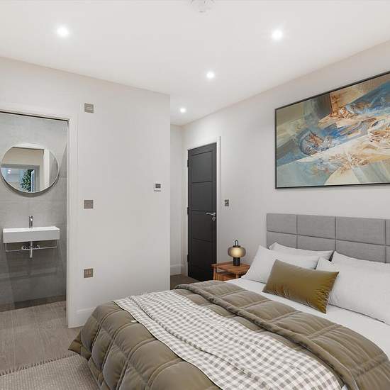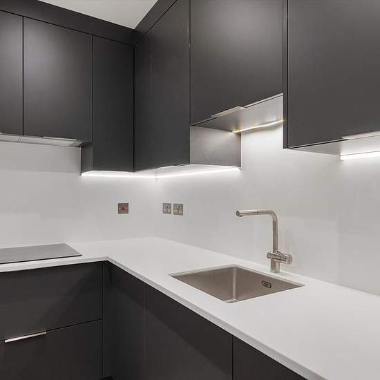 Step into this spacious apartment, offering an impressive 1,353 sq ft of living space. The sleek, modern kitchen is thoughtfully designed with dark cabinetry and clean lines, strikingly contrasting against the bright, minimalist countertops. Under-cabinet lighting illuminates the work surfaces, creating an inviting, practical space for cooking. Complete with an integrated induction hob and streamlined fittings, this kitchen blends efficiency with a polished, contemporary aesthetic. Every bedroom is spacious, and two of them have built-in clo...