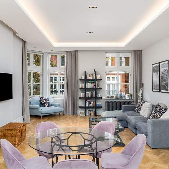 On the first floor of a striking red-brick mansion block in Kensington Court, this beautifully reimagined apartment balances classical proportions with a contemporary sensibility. High ceilings and parquet flooring run throughout, while tall sash windows draw in soft light and leafy views. The heart of the home is a generous open-plan living space, designed for both comfort and conviviality. A large island anchors the kitchen, fitted with Miele appliances and a wine fridge, while defined dining and sitting areas create a natural flow. The re...