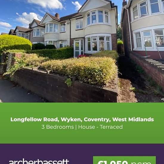 Featured Property To Let Longfellow Road, Wyken, Coventry, West Midlands 3 Bedroom, House - Terraced. Per Calendar Month £1,050 pcm More info here: THREE BED FAMILY HOME MODERN AND SPACIOUS GARAGE TO REAR UNFURNISHED KIDS OK PETS NO For your FREE, NO OBLIGATION VALUATION on your own home call our friendly local team or request via