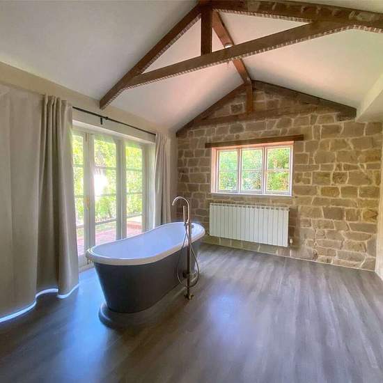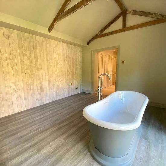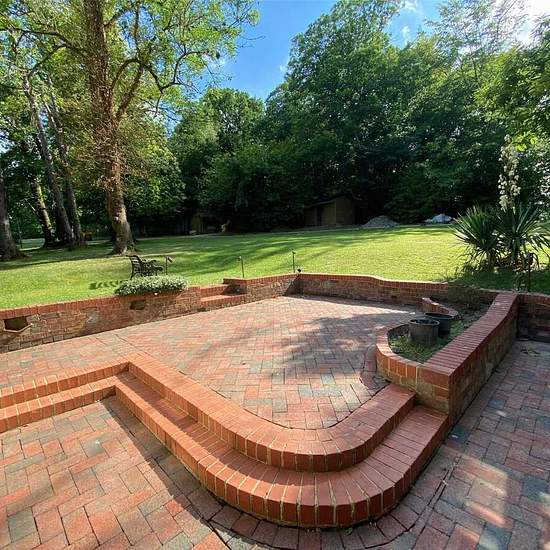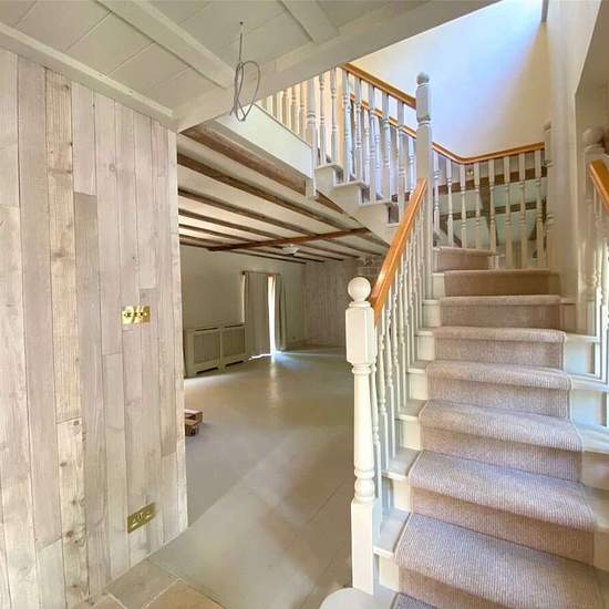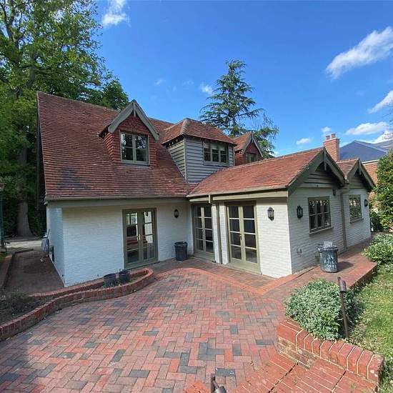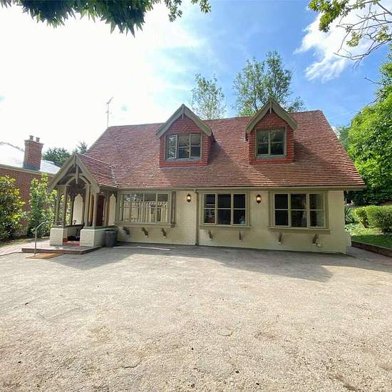 Nestled in a picturesque woodland setting, this contemporary family home offers stylish and comfortable living throughout. Upon entering, the hallway leads into an open-plan living area featuring exposed wooden beams, a striking stone chimney with a fireplace, and two sets of doors that open onto a spacious rear patio. The modern kitchen is equipped with sleek upper and lower cabinets topped with stone countertops, a range of integrated appliances, and double doors that also open out to the patio and garden beyond. The ground floor also incl...