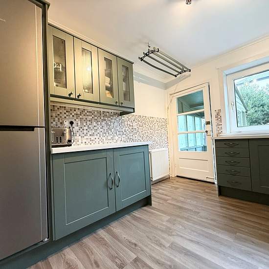 Accessed via a side entrance, the property opens into a welcoming hallway with a useful storage cupboard. From here, you are led into a spacious and bright living room, enhanced by dual-aspect windows that allow an abundance of natural light to flood the space. The ground floor also features a family bathroom, fitted with both a separate shower and bath for added convenience. The modern, fully fitted kitchen is of a good size and offers ample storage and workspace. Just off the kitchen is a rear porch, providing access to the large rear gar...