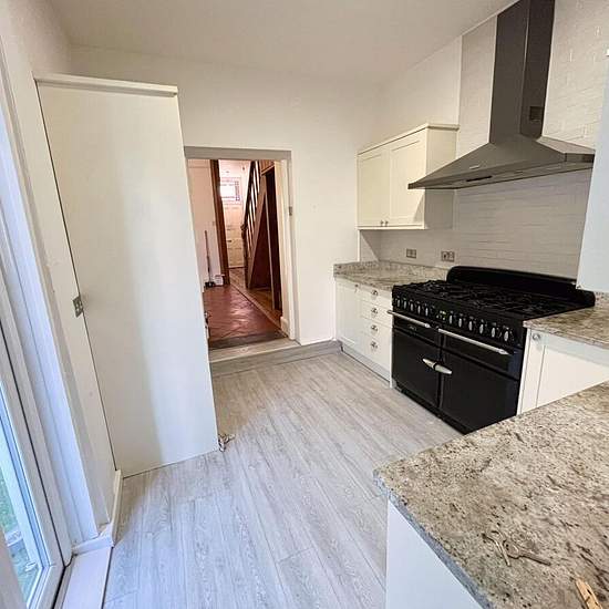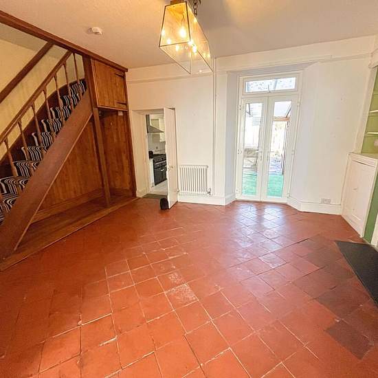 Centrally located, three bedroom, 1920's built town house of of excellent proportions including a private rear garden with useful rear leisure building. Accommodation comprises: Open storm porch, Hallway, Open plan to a central DINING ROOM, recessed wood burning fire with uPVC double glazed French doors to the rear covered storage space. Double opening from Dining Room and door from Hallway to front Living Room with cast iron fireplace with marble surround. Kitchen with a range of modern shaker style cupboards with granite worktops with inse...