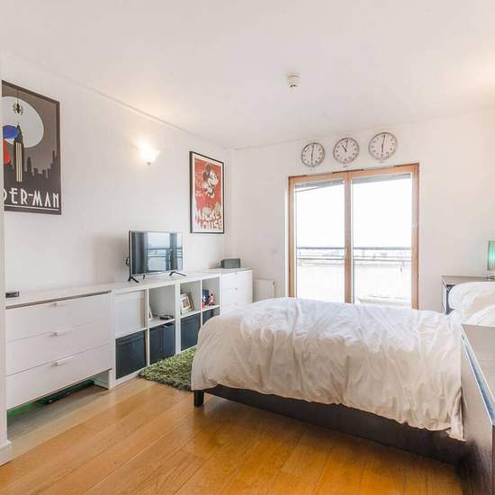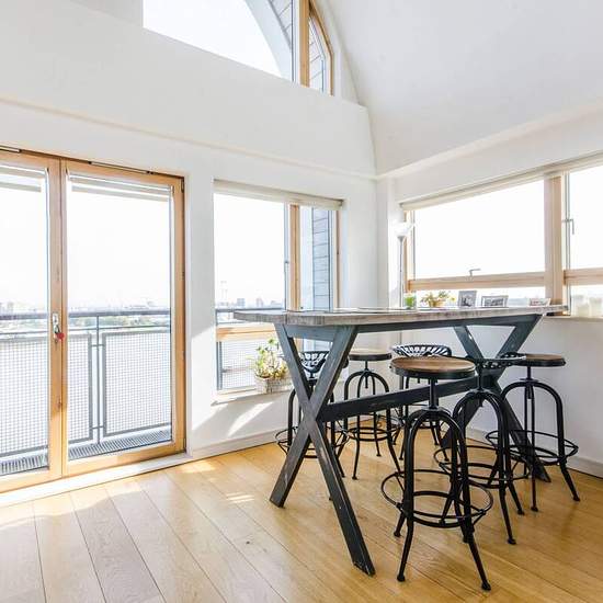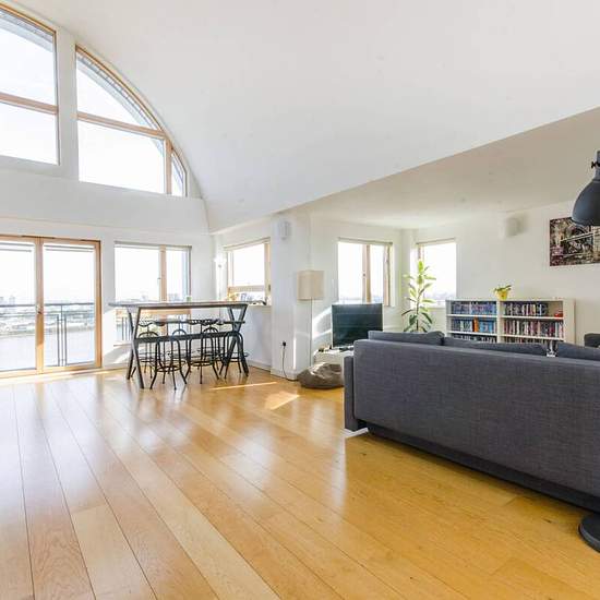 Exceptional triple aspect reception perfect for entertaining Large windows and barrel-vaulted double height ceiling Open-plan kitchen with breakfast bar Private roof terrace and two balconies with stunning views Main bedroom with en suite shower room Two further double bedrooms and additional bathroom Close to North Greenwich Jubilee line station Available with Zero Deposit Positioned within a modern riverside development on the ninth and tenth floors, a hugely impressive, bright three bedroom flat with incredible 180 degree views over the T...