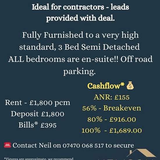 R2SA | Chester | Direct-to-Landlord A strong rent-to-serviced-accommodation opportunity in a prime contractor location. 3-Bed Semi-Detached Fully furnished to a very high standard ALL bedrooms en-suite Off-road parking Ideal for contractor lets Leads provided with the deal The numbers: • Rent: £1,800 pcm • Bills approx: £395 • Cashflow up to £1,689 pcm at 100% occupancy • ANR: £155 Chester – high demand, strong occupancy, scalable model. Serious enquiries only Contact Neil –8 517 to secure.