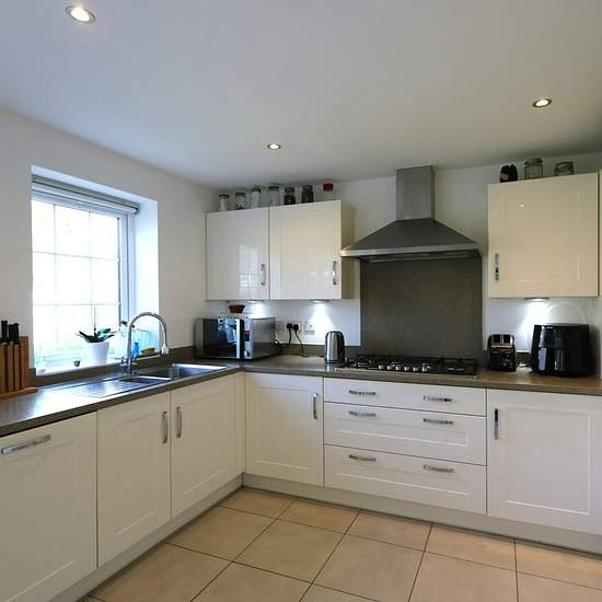 This well presented, four bedroom, detached house is situated on the popular Heathcote development, opposite Nuffield leisure centre and close to motorway connections, schools and local amenities. The property comprises spacious entrance hall with guest W.C housing under stairs storage. Off the hallway is a home office/study room and a large lounge with feature bay window. The good sized, bright kitchen benefits from a range of built in modern appliances and dining area with extended glass doors and windows leading out to a well maintained ...